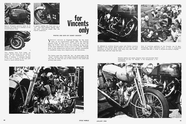 The solo bikes are powered for the most part by JAPs, the old stand-by of the European dirt tracker, and Esos, built in Czechoslovakia. Both of these motors feature total-loss lubrication, lengthy pushrods, and in this case, large bore carburetors jetted for methanol. The engines are fitted into a variety of frames, some of which have swing-arm rears and some of which carry the wheel rigidly. Usually the front fork is of girder-type construction, housing a rubber-damped slider within its lower extremity. Without exception, these solos are brakeless and some have no gearbox, an arrangement which eliminates all controls but throttle and clutch. Aside from the JAPs and Esos, there was an assortment of NSU/Eso, Rudge/JAP. Velocette/JAP, and Norton/JAP specials.