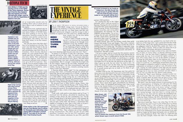 This is also the first year for Honda's water-cooled RC with Pro-Link single shock. The overall design is similar to Kawasaki’s, but the Honda seems more carefully thought out and offers some significant advantages. The Honda shock is upside-down, compared with the Kawasaki. and it fits directly between swing arm and frame, w hile the Kawasaki uses a rocker arm. The Honda design weighs less and is simpler. The shock itself, made by Showa or Kayaba. can be tuned for damping. spring pre-load and wheel travel with the shock in place, while the Kawasaki needs to come out for tuning. Honda forks are 39-mm Showas. and w heel travel—also again—is 300 mm.
